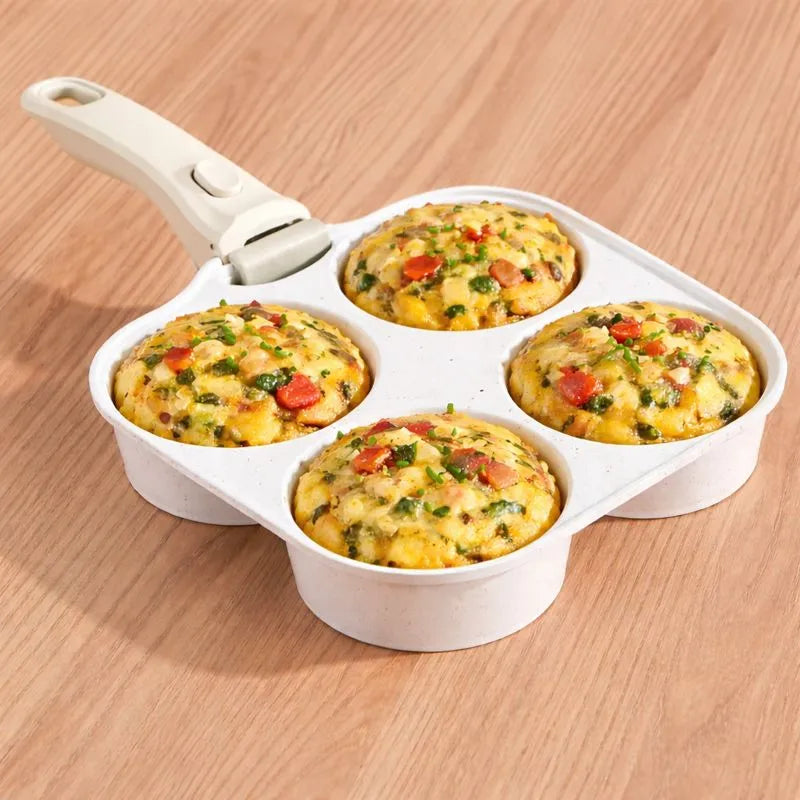 Slowly pour the egg mixture into the compartments of the breakfast pan, filling each section almost to the top without overflowing. Gently tap the pan on the counter to remove air bubbles and help the mixture settle evenly. Before placing the pan in the oven, remove the handle.