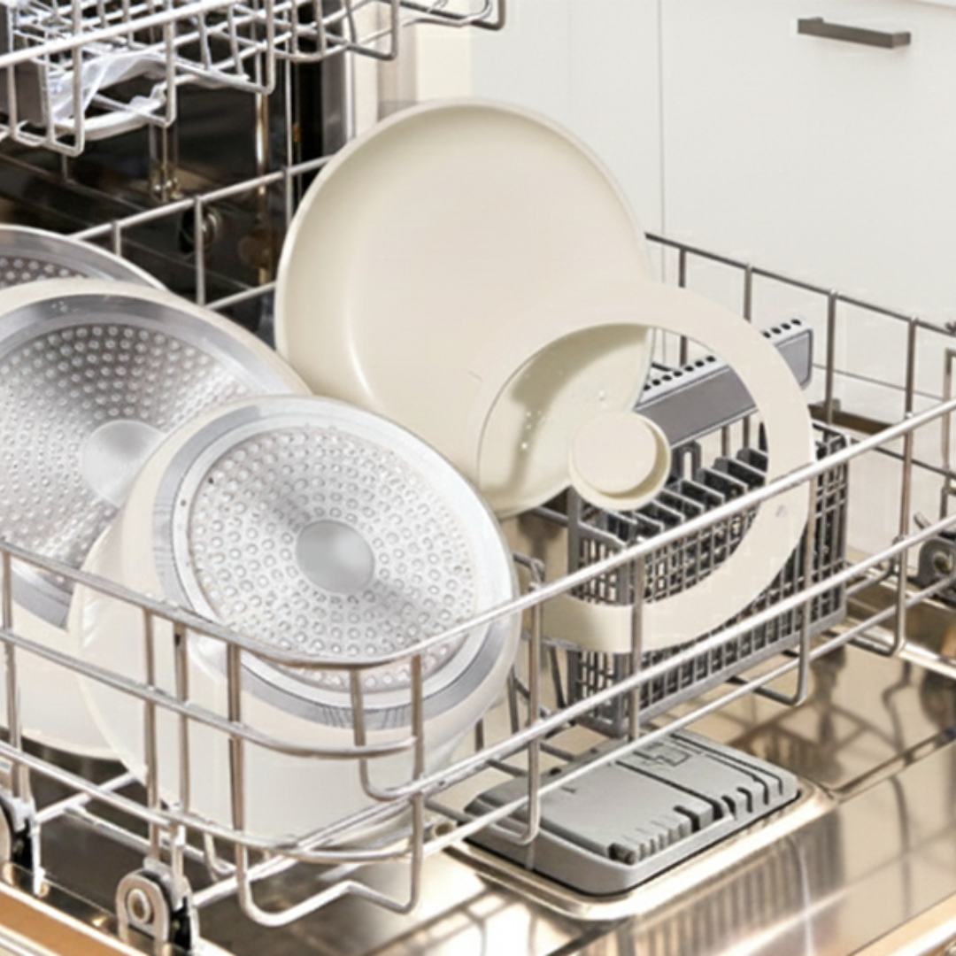 Dishwasher detergents are typically more abrasive than hand-washing soaps, and repeated dishwasher cycles can gradually affect the non-stick surface and exterior finish. While occasional dishwasher use will not cause immediate damage, frequent use may shorten the lifespan of the coating.