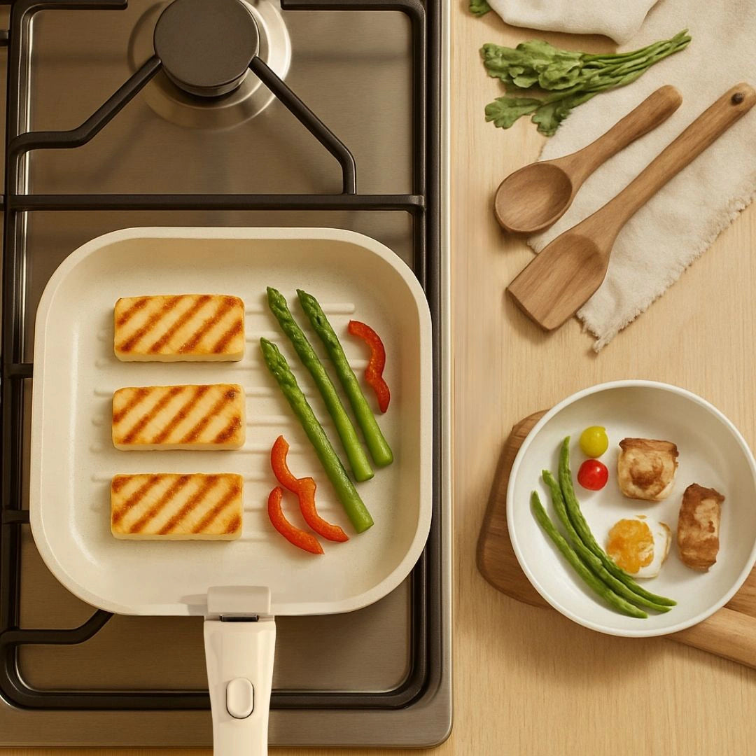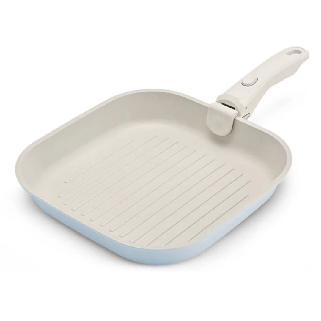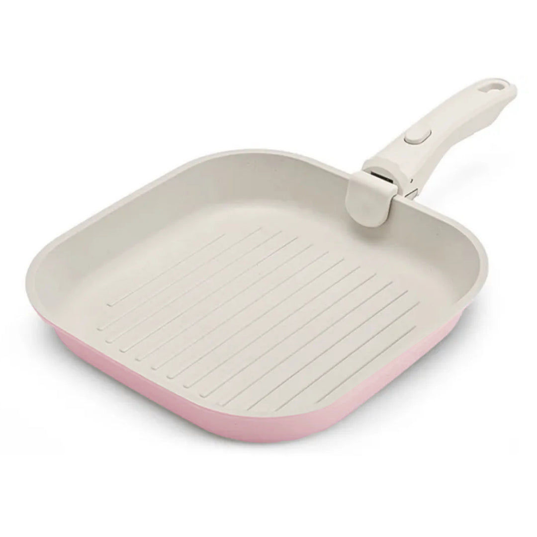 A non-stick grill pan with a detachable handle, designed to complement our Cookware Set.