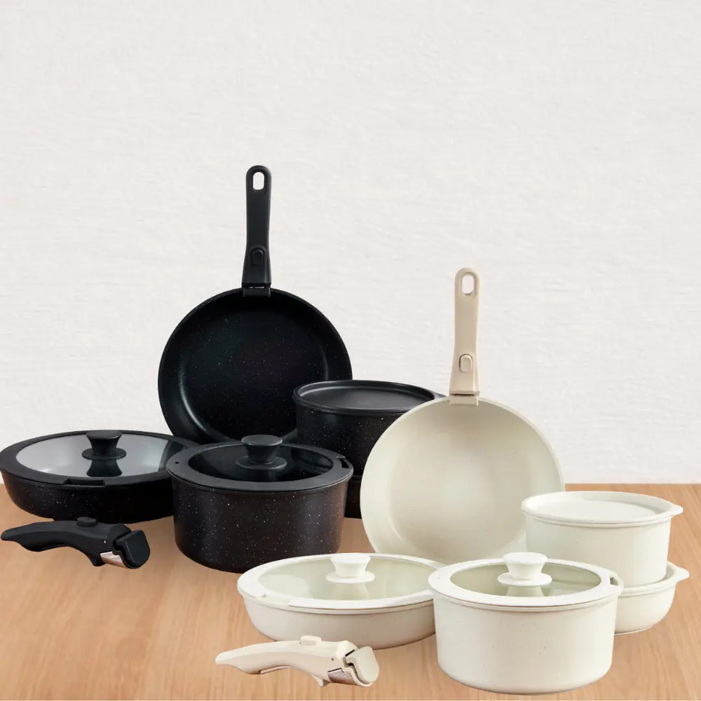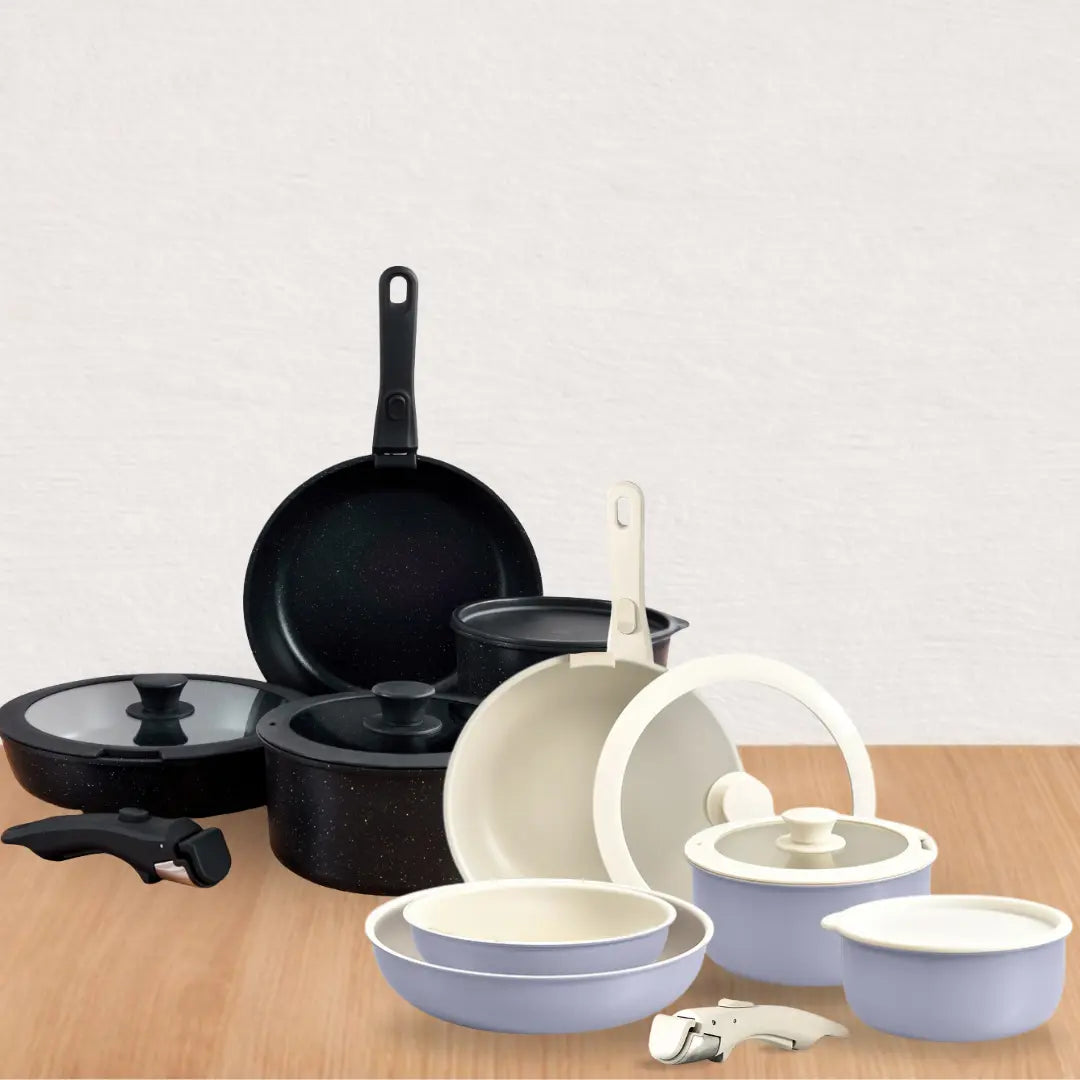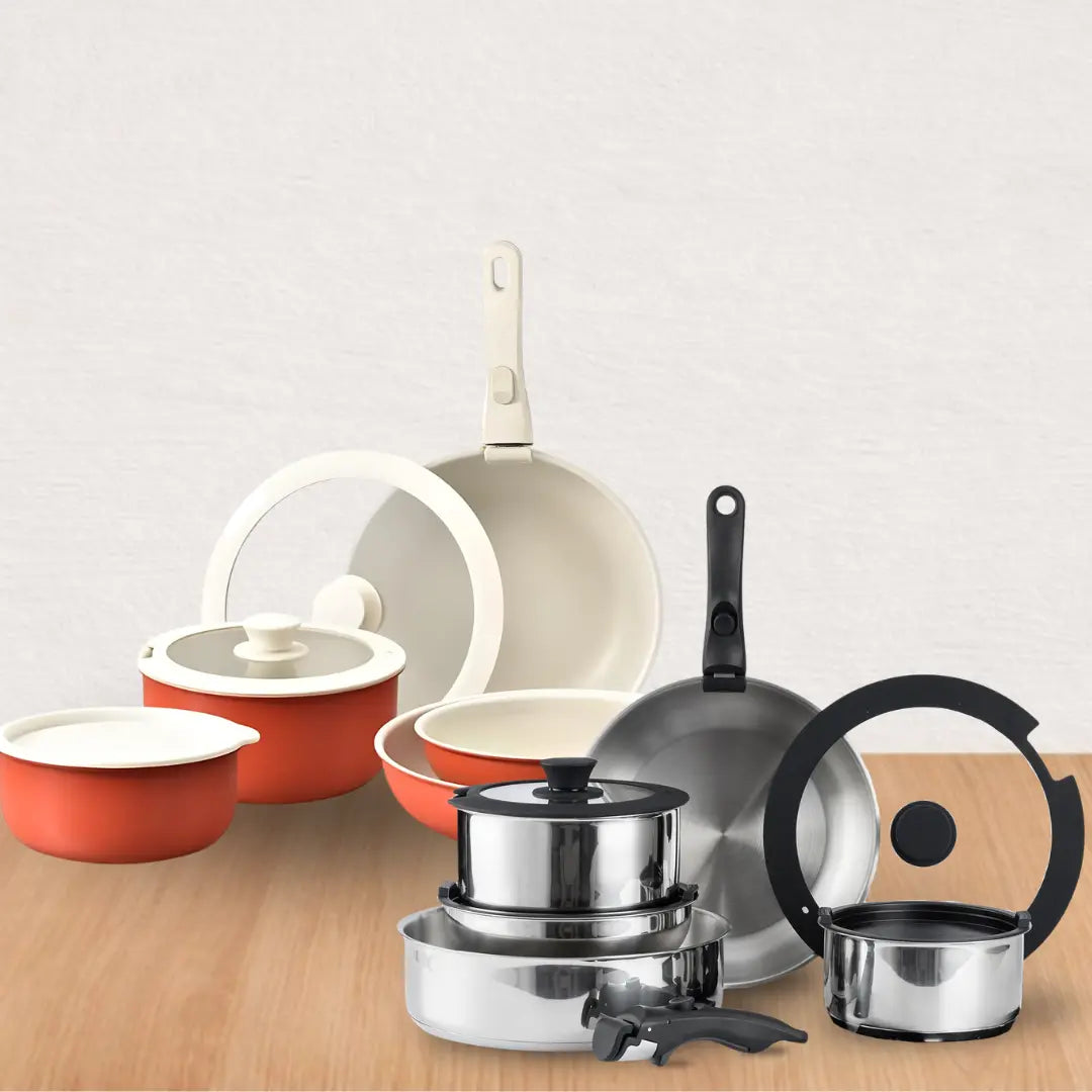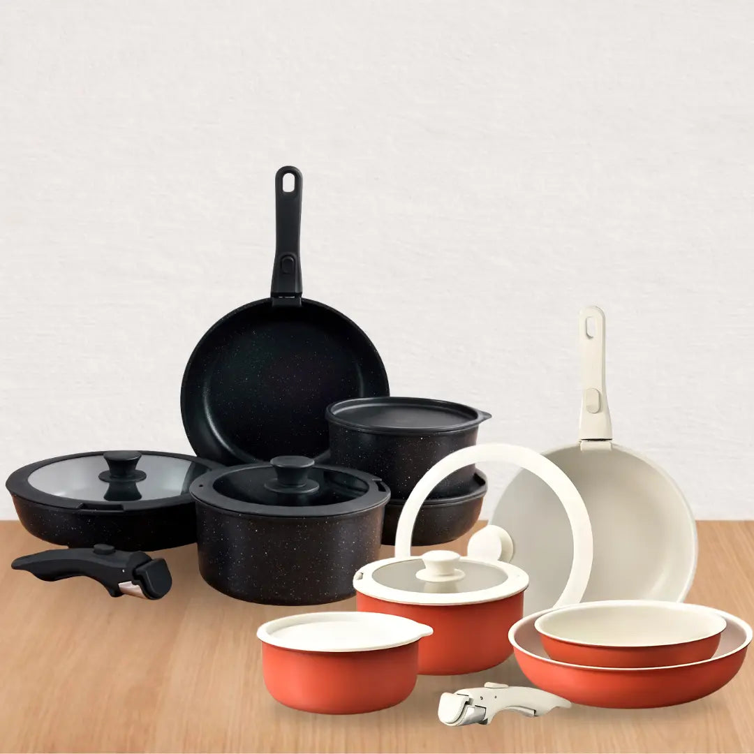 Unlike normal cookware that's impossible to set, these pans fit perfectly into each other allowing you to store it neatly in a compact space without taking up much room.