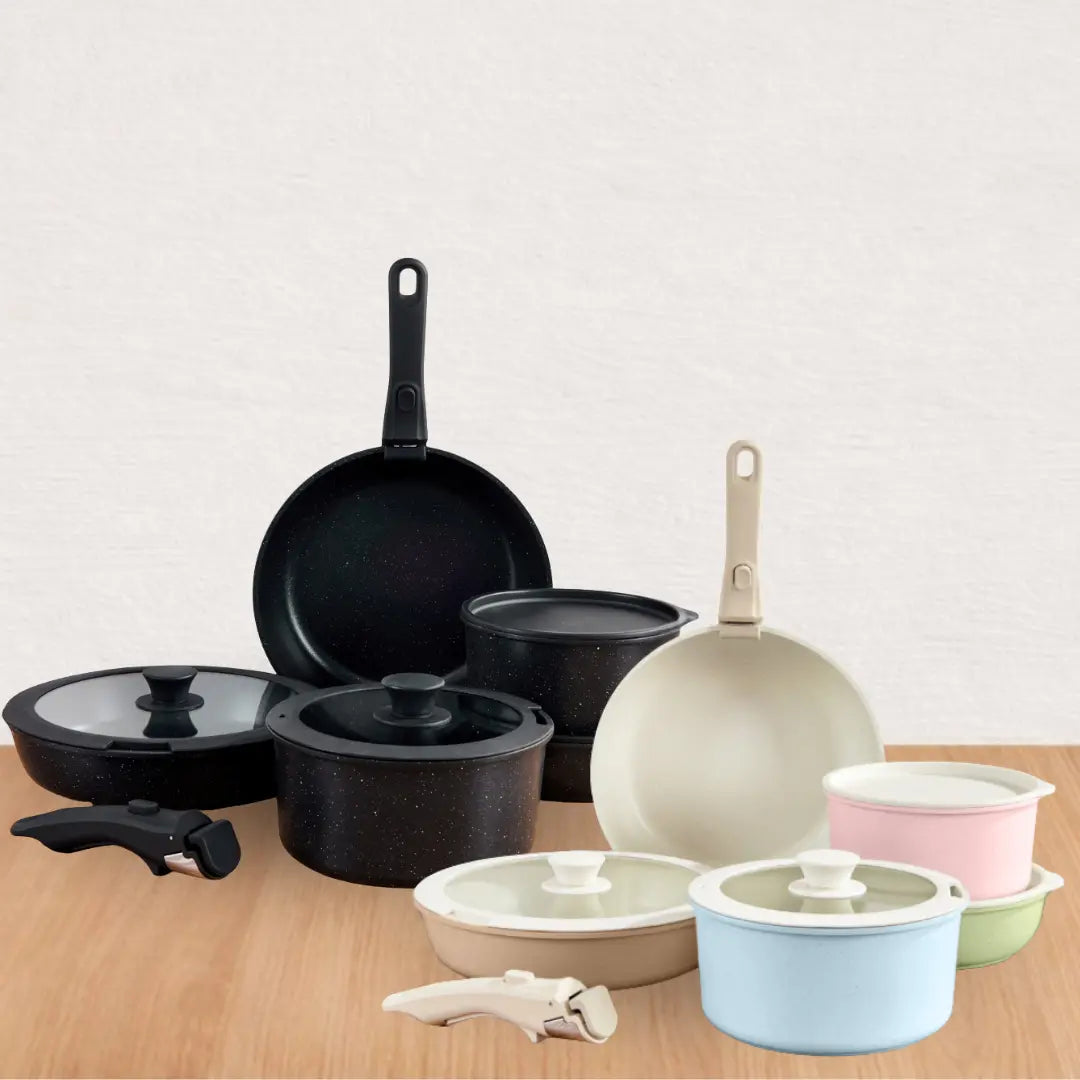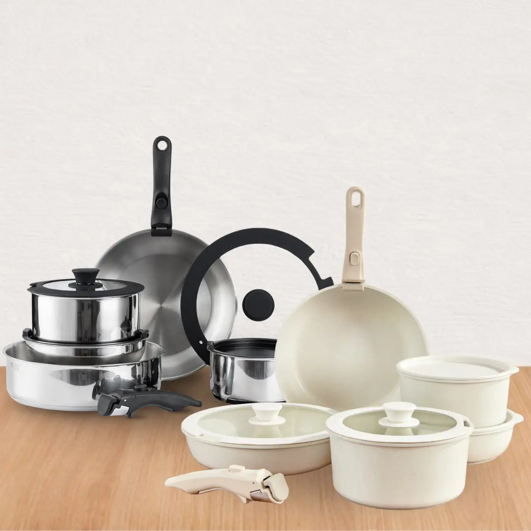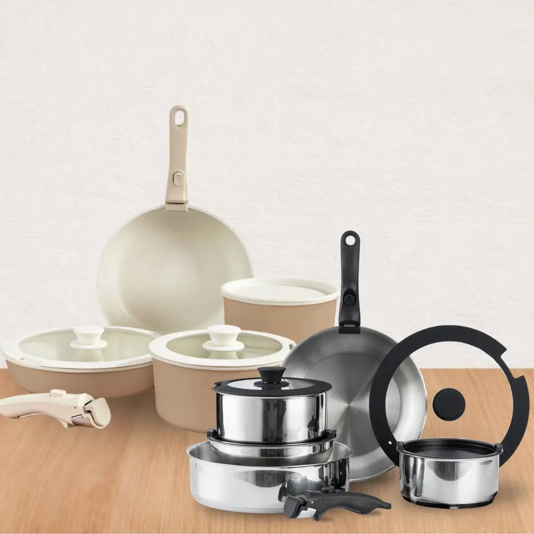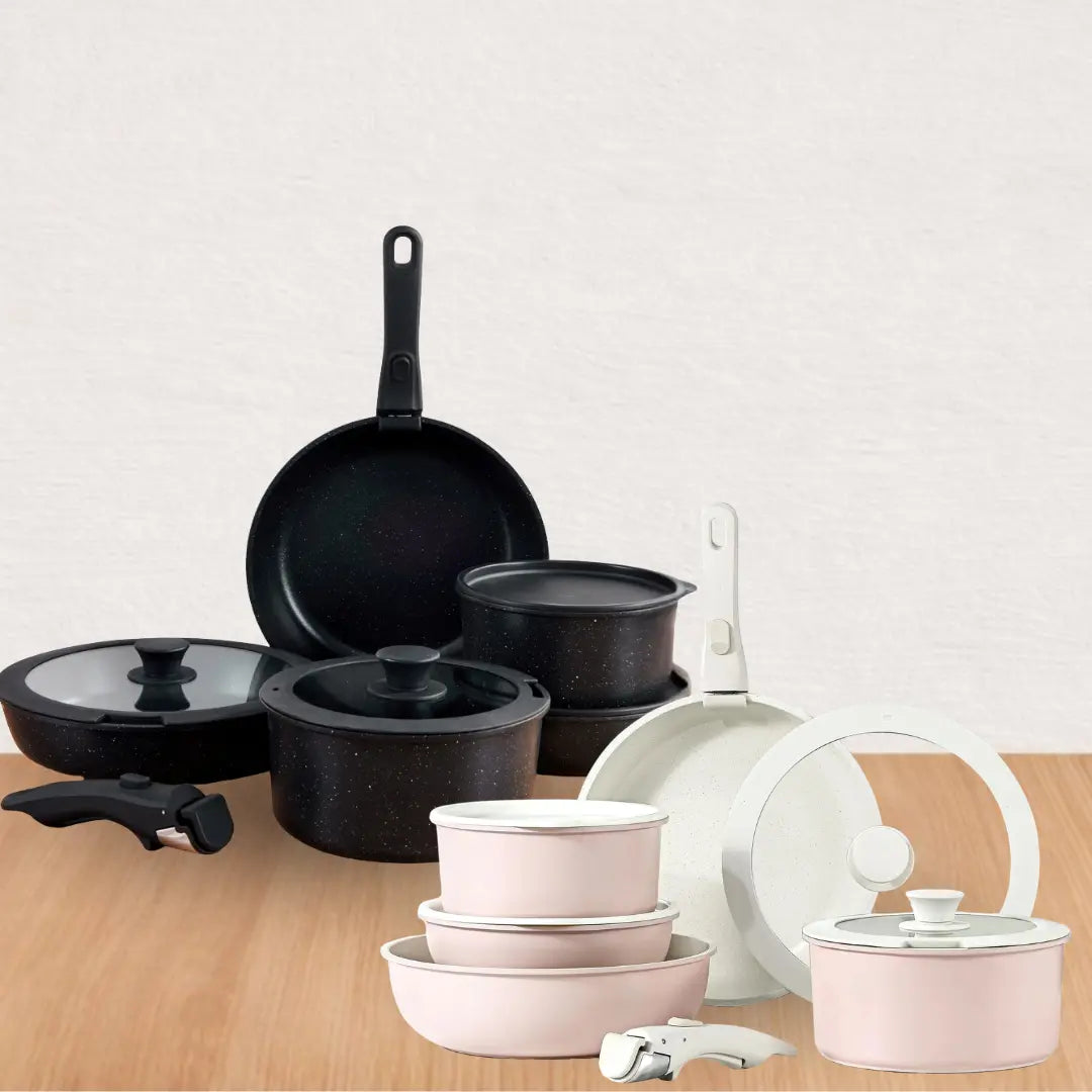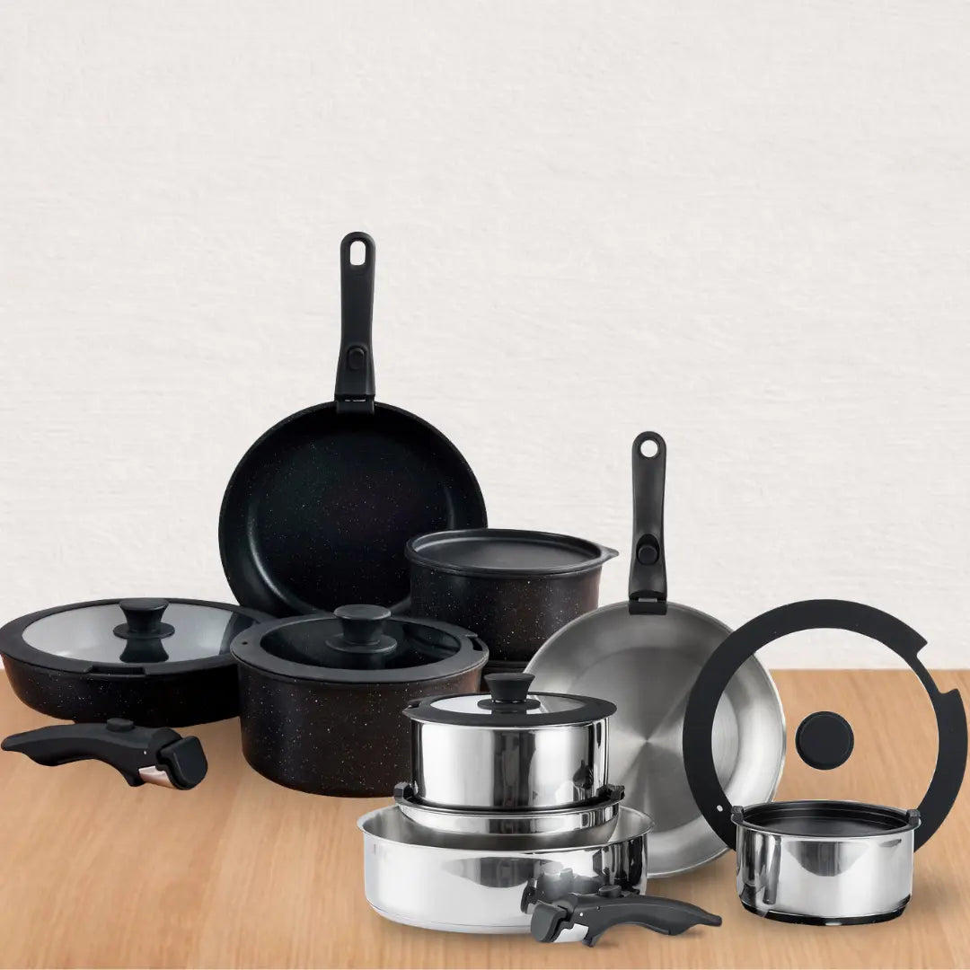 Unlike normal cookware that's impossible to set, these pans fit perfectly into each other allowing you to store it neatly in a compact space without taking up much room.