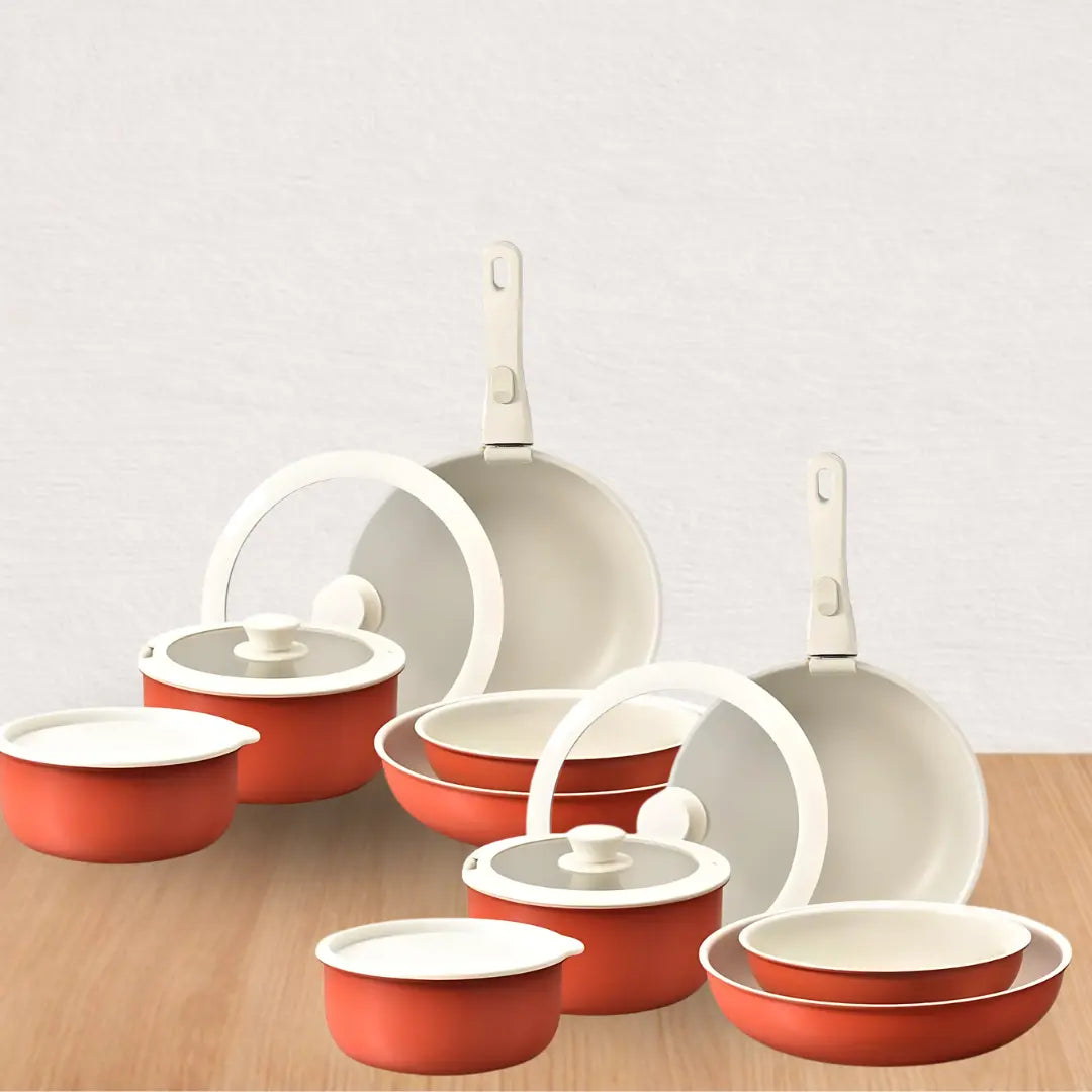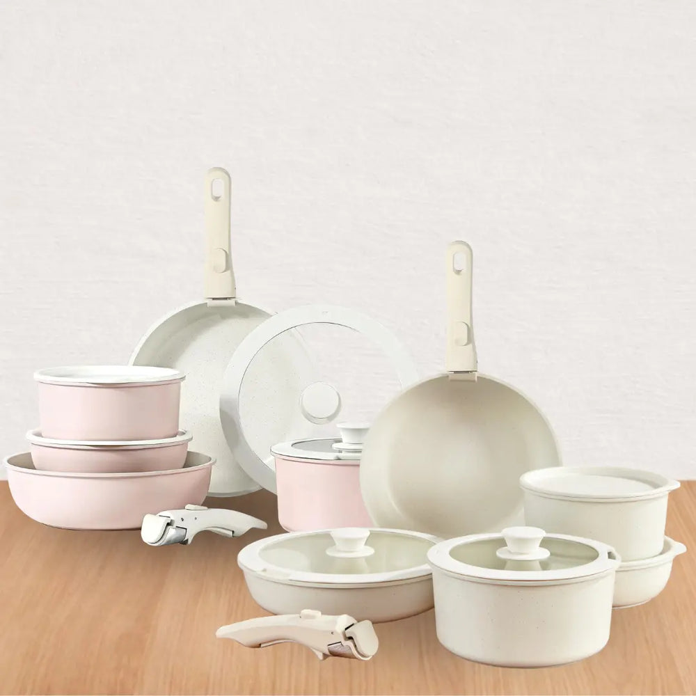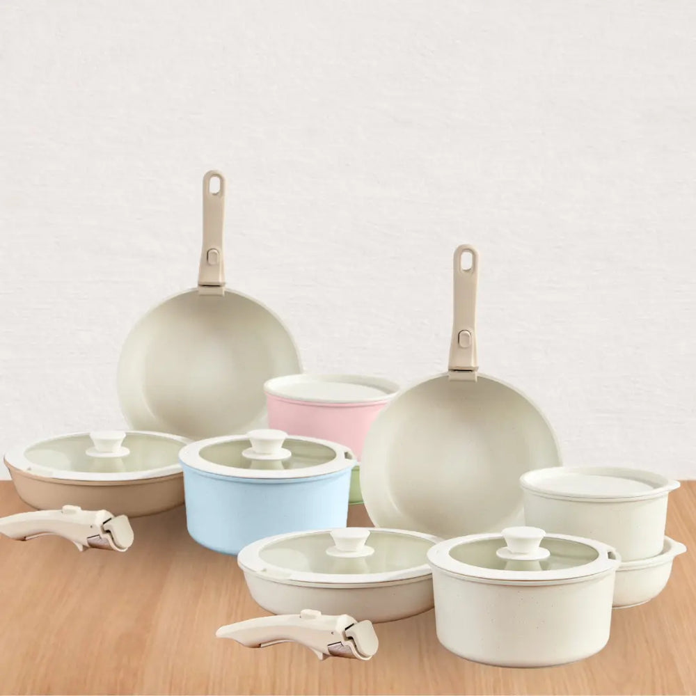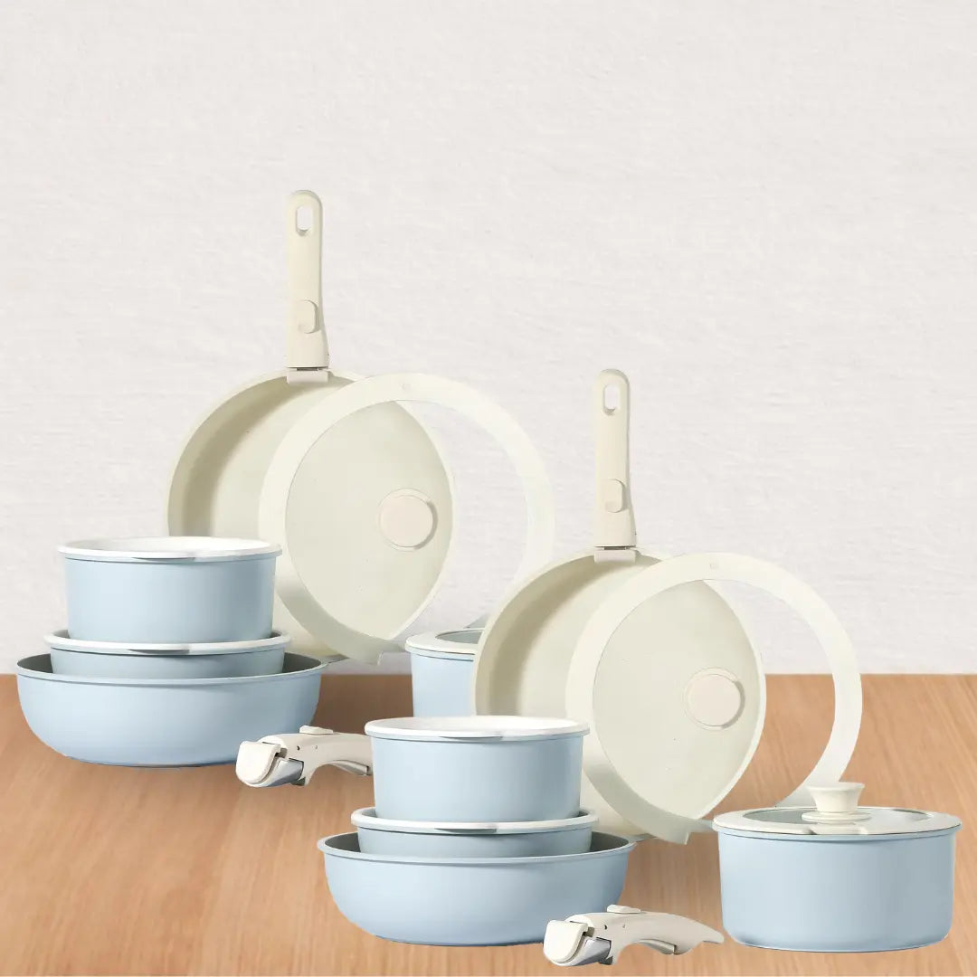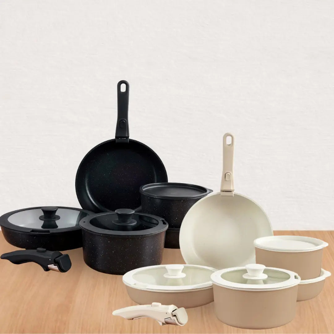 Unlike normal cookware that's impossible to set, these pans fit perfectly into each other allowing you to store it neatly in a compact space without taking up much room.