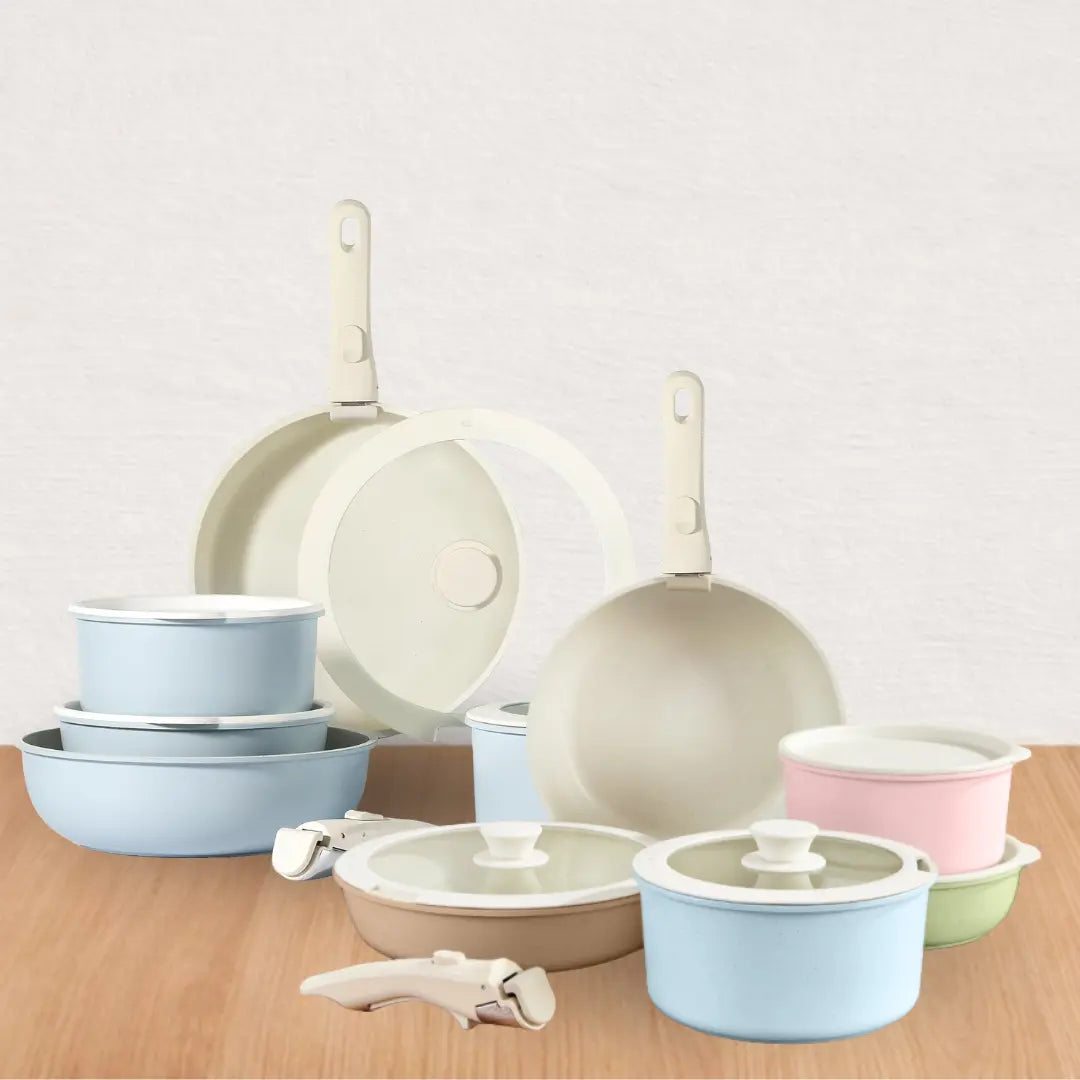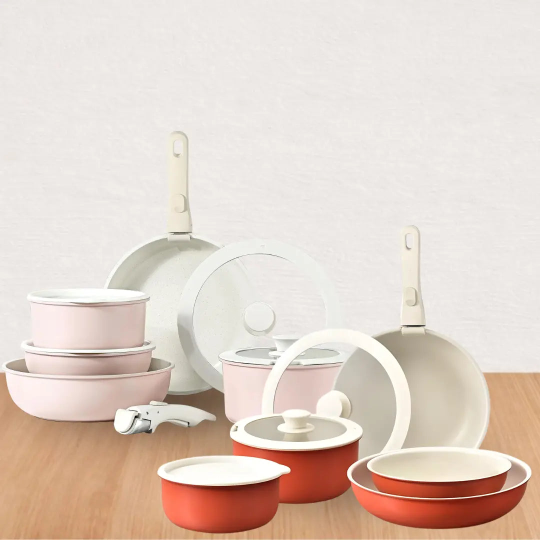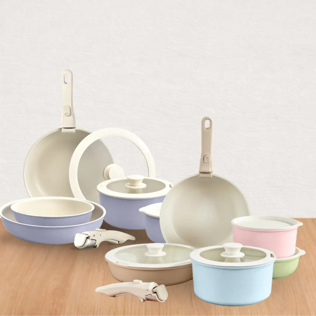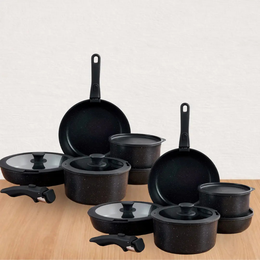 Unlike normal cookware that's impossible to set, these pans fit perfectly into each other allowing you to store it neatly in a compact space without taking up much room.