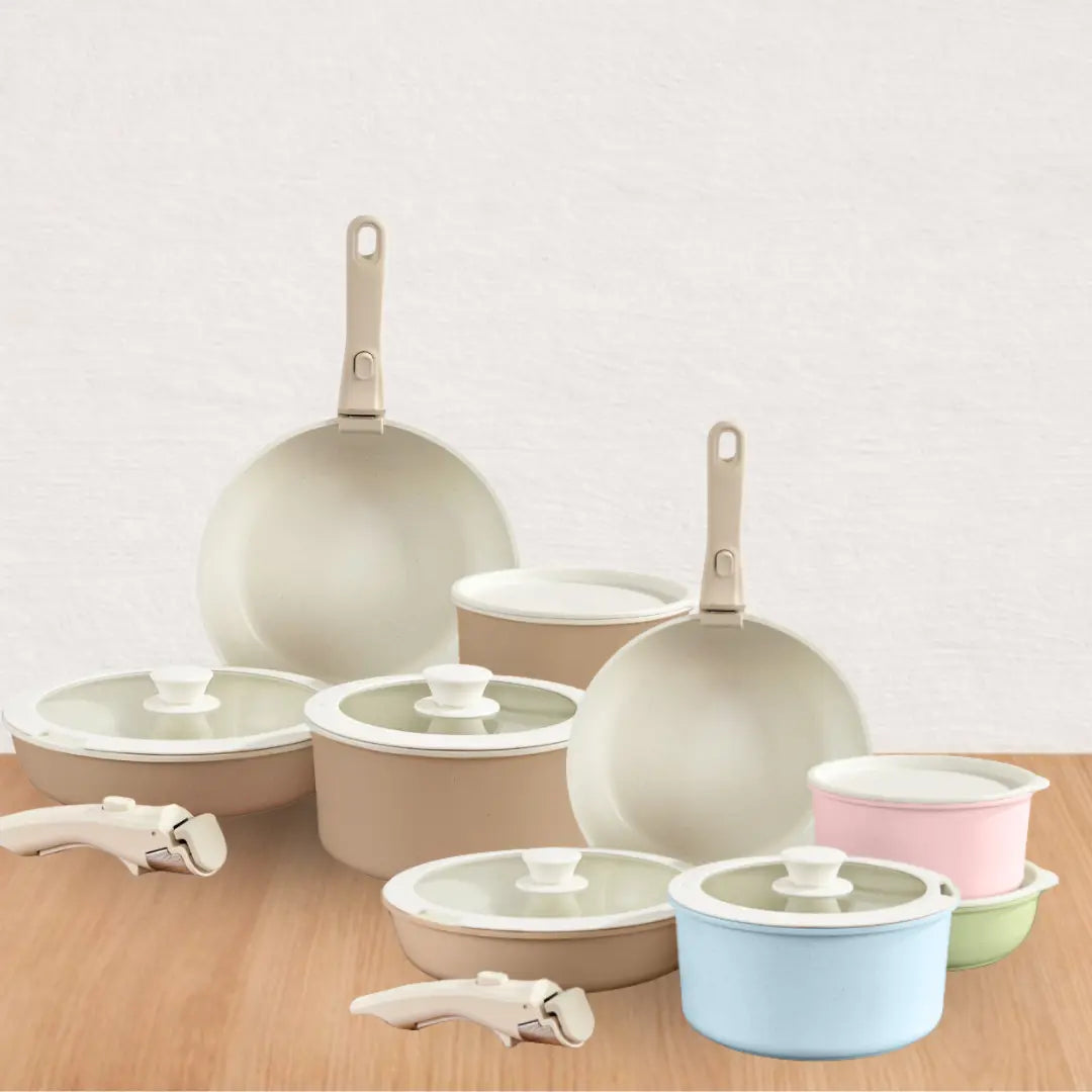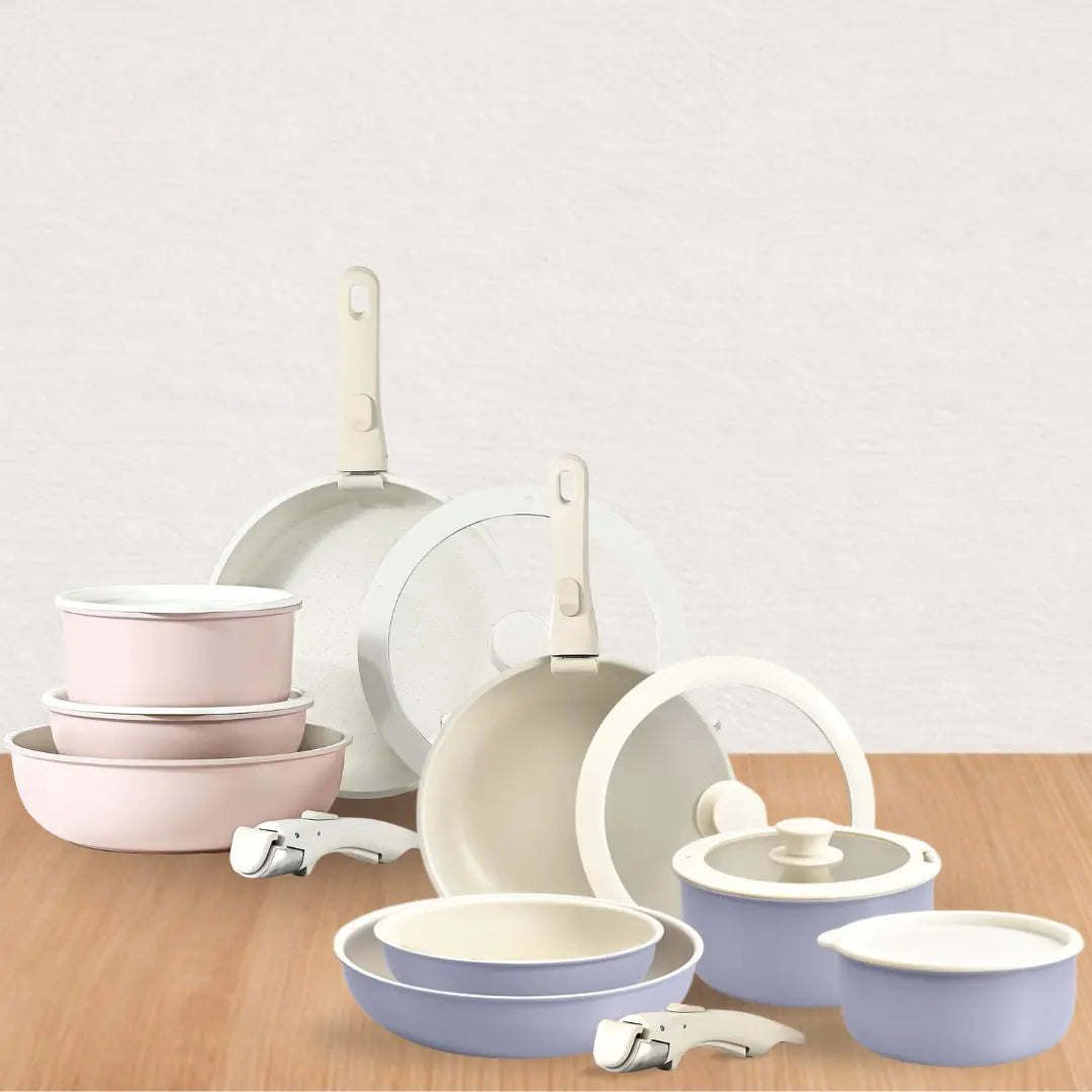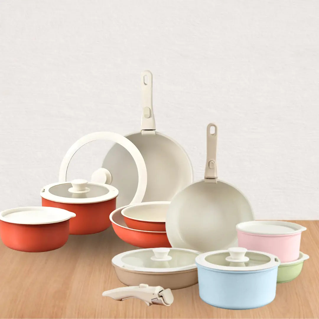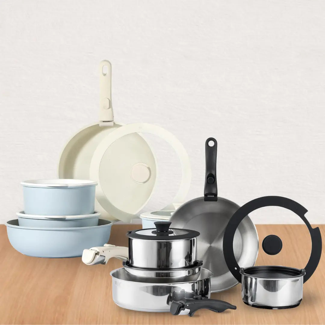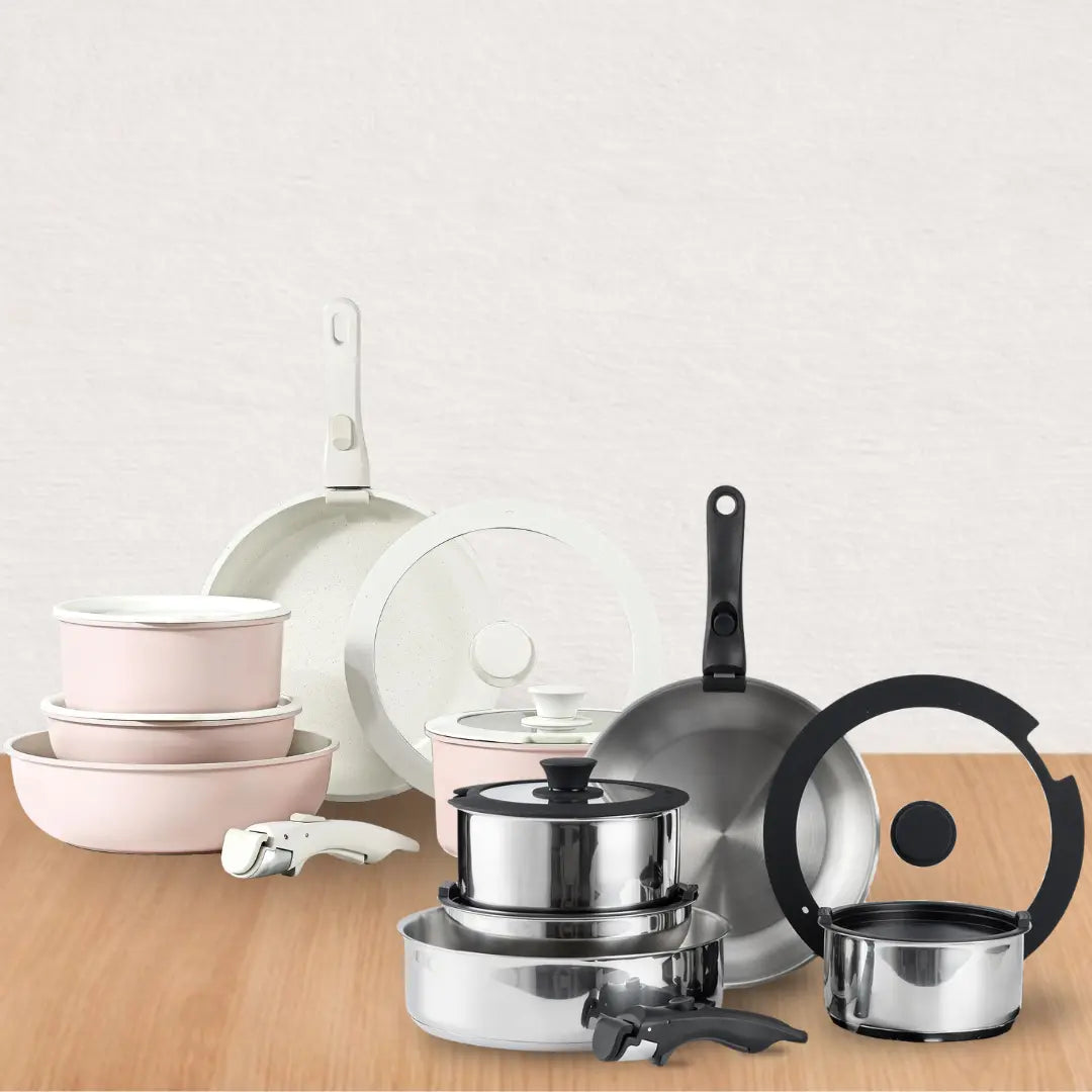The cookware set uses a detachable handle design to save storage space in your kitchen.