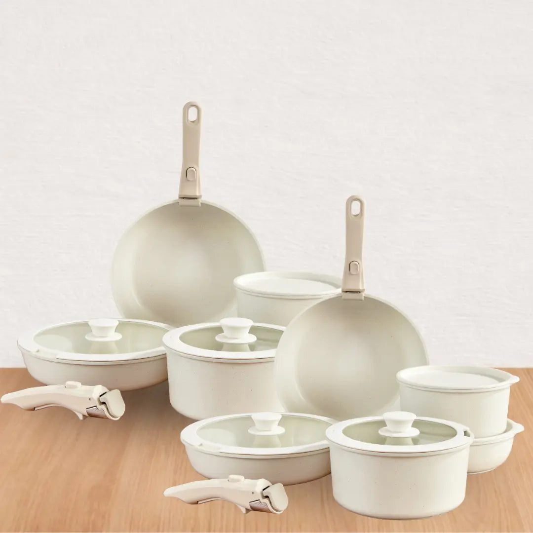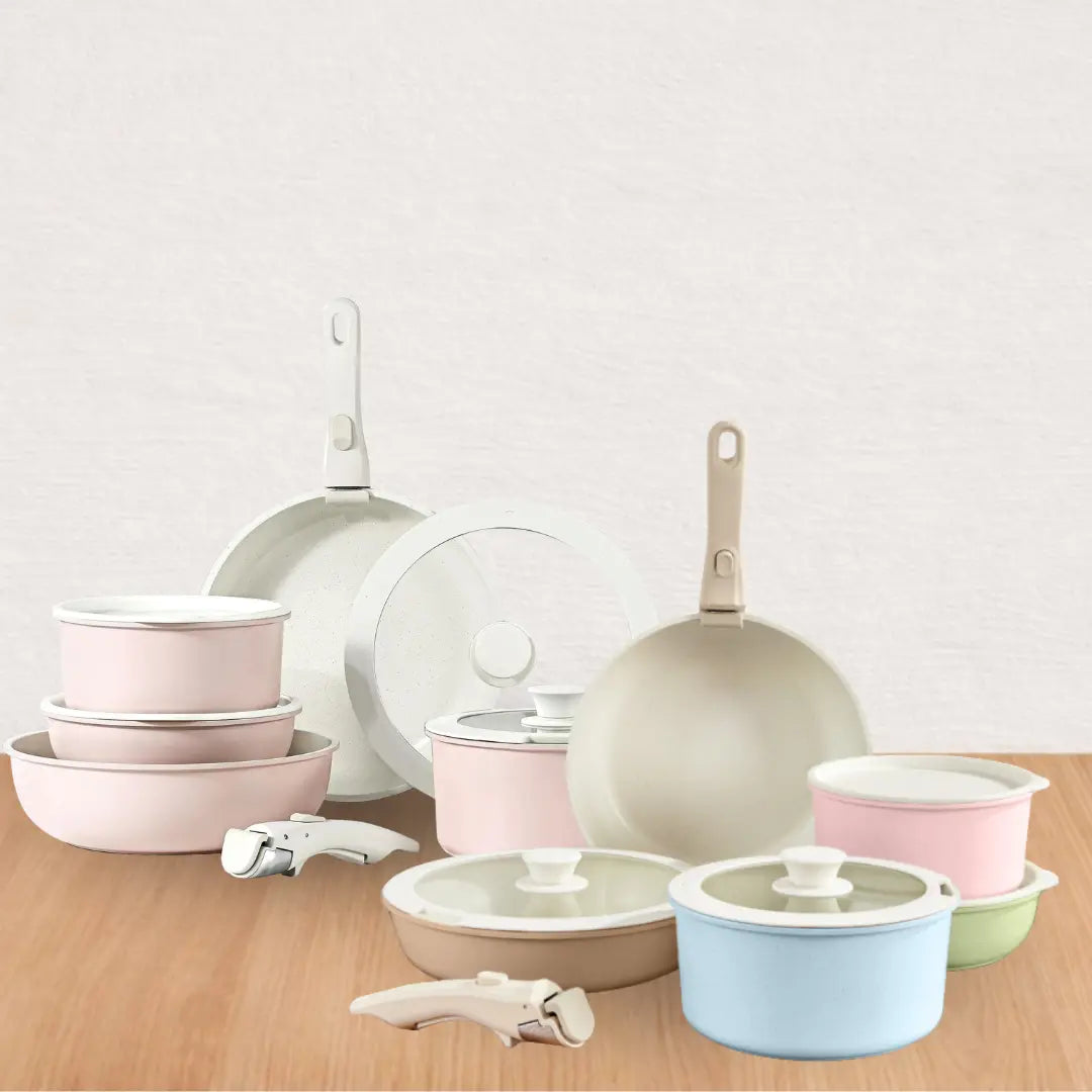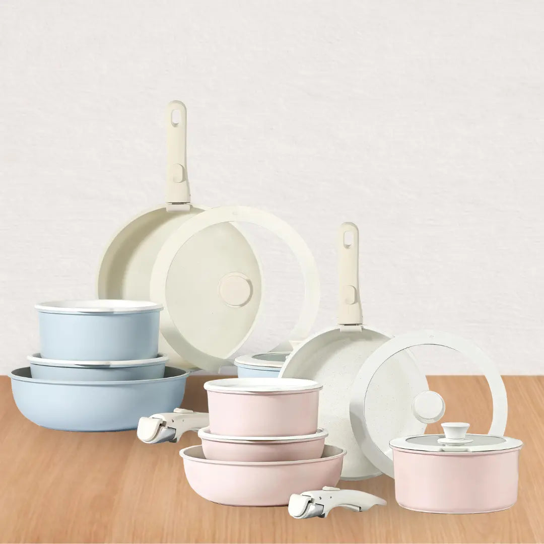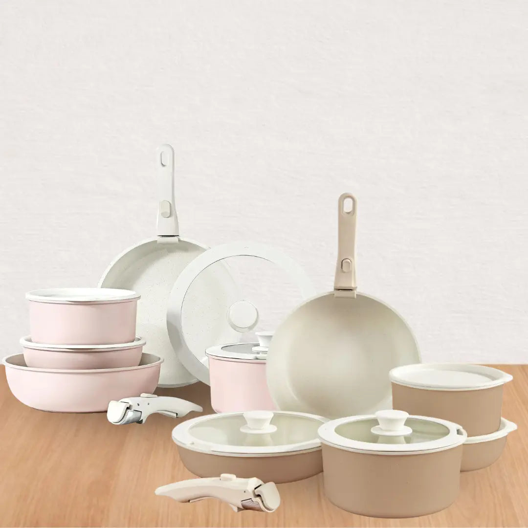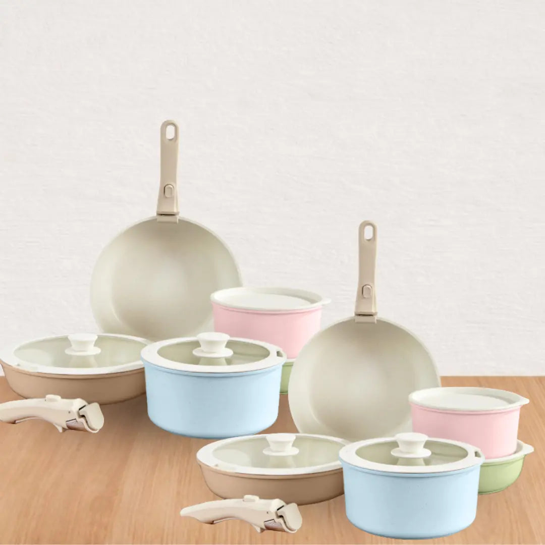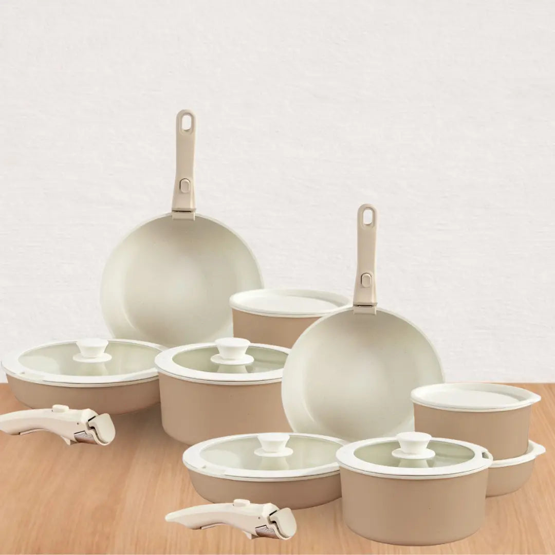 The cookware set uses a detachable handle design to save storage space in your kitchen.