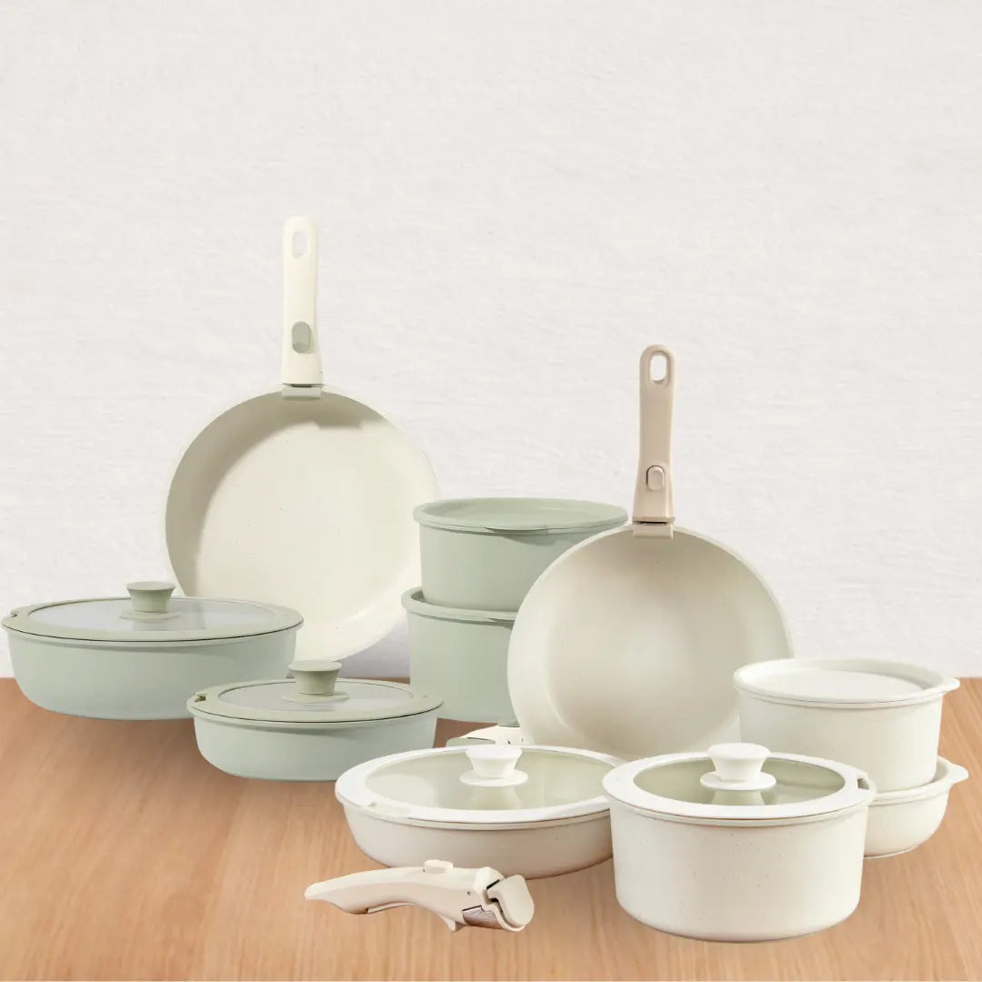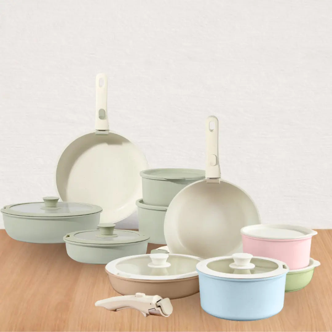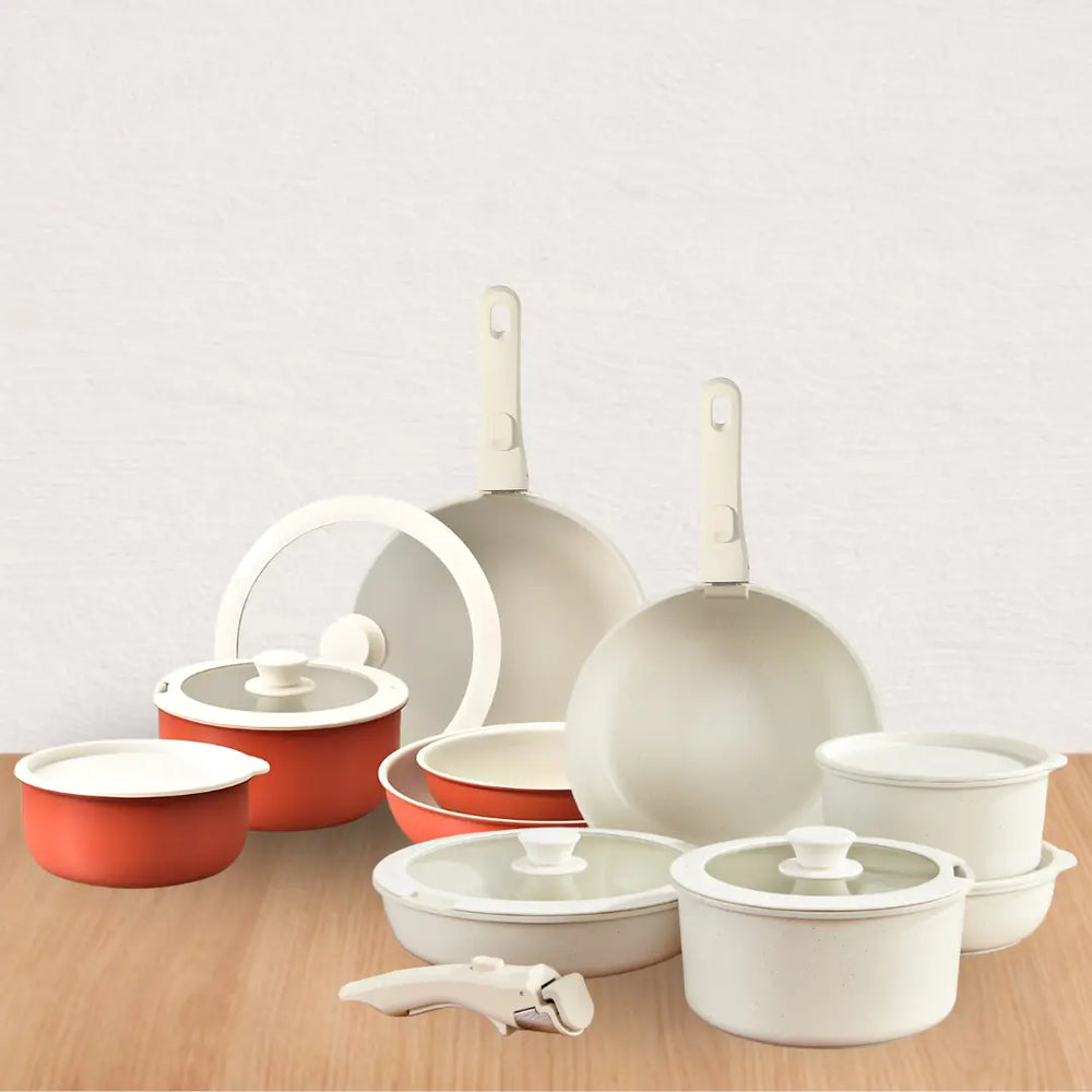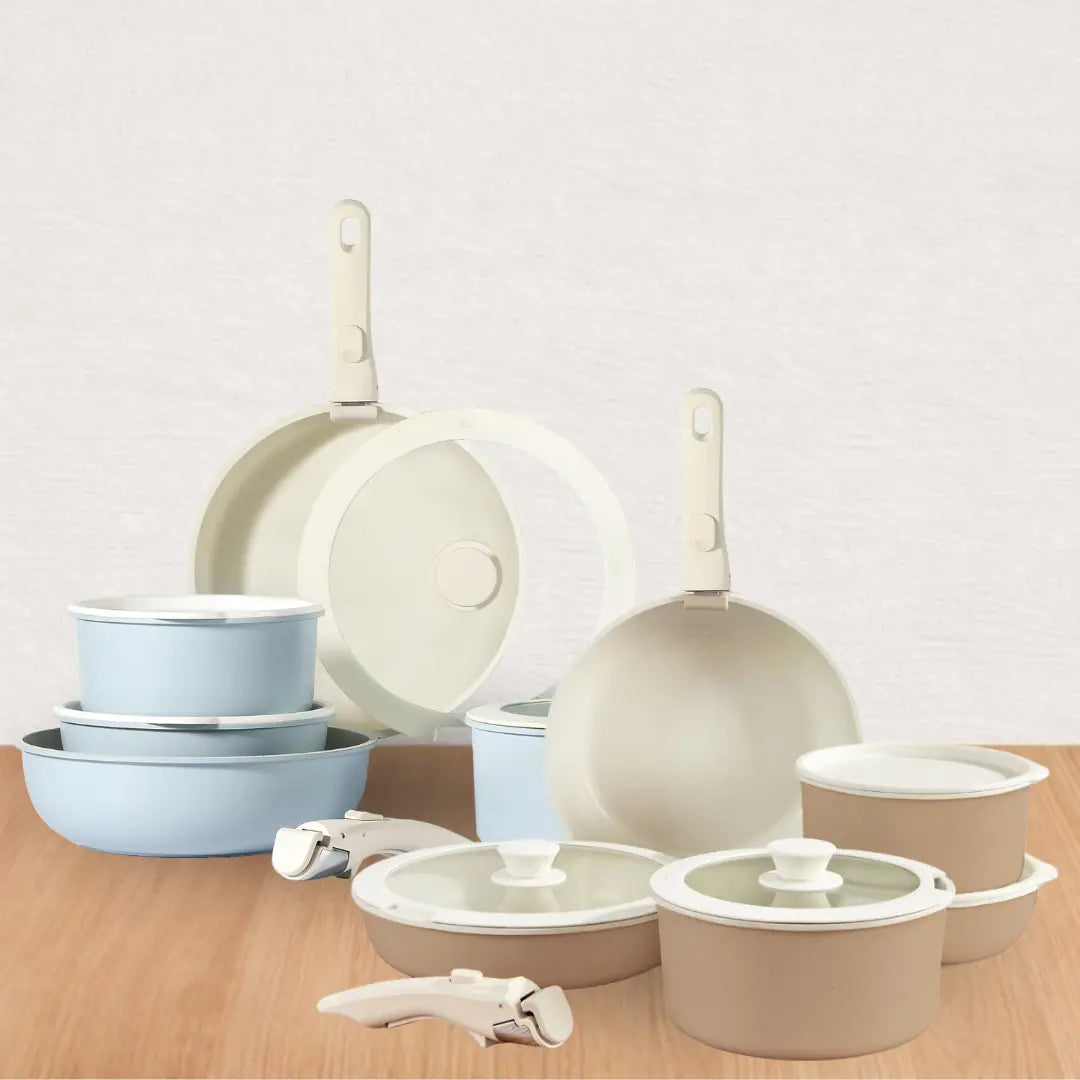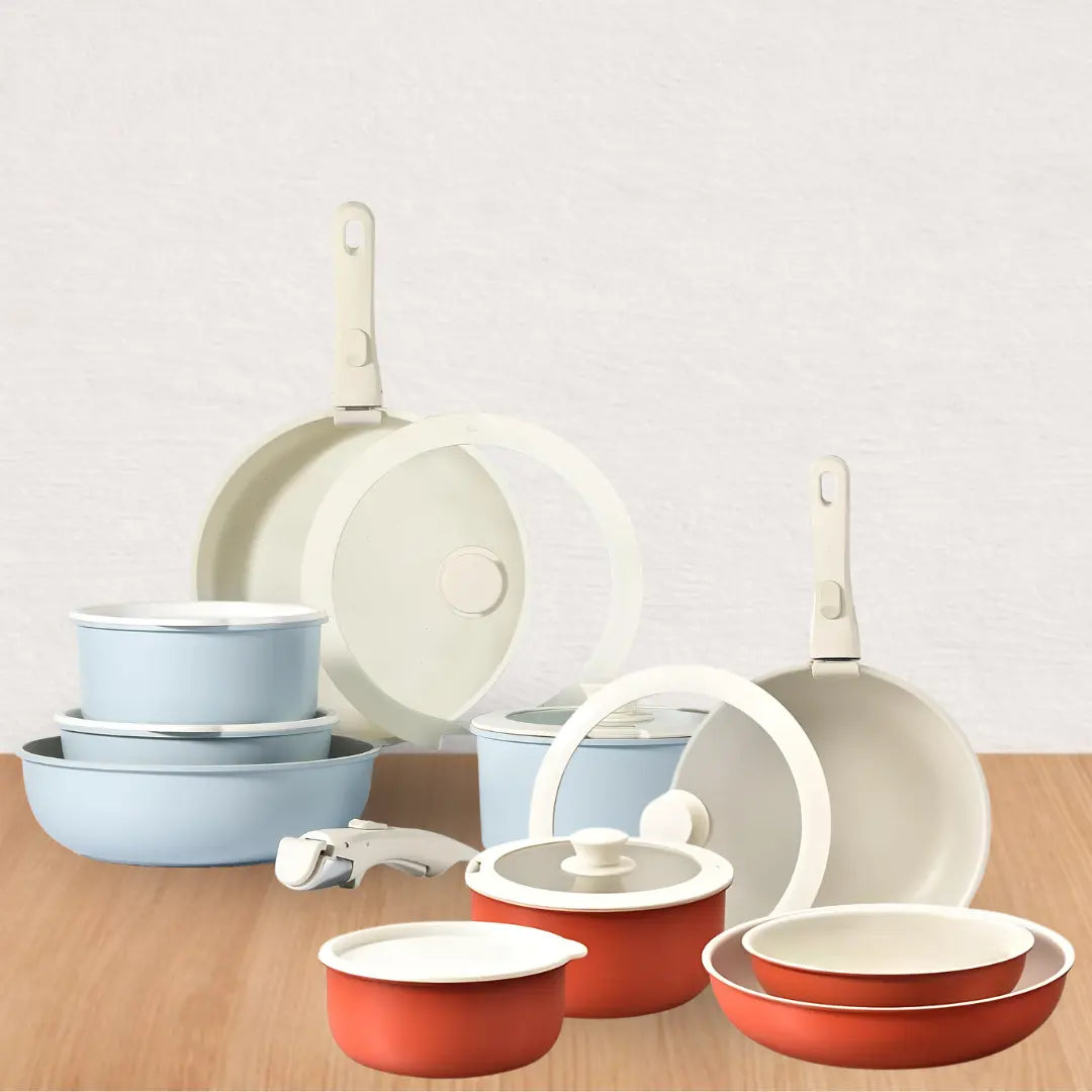 The cookware set uses a detachable handle design to save storage space in your kitchen.