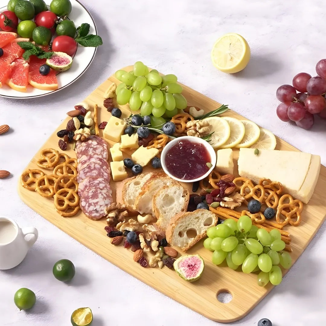 Naturally beautiful bamboo grain and a built-in low-profile handle let you lift and present charcuterie, cheeses, or dessert spreads straight to the table. The expansive surface layouts a full party board without crowding.