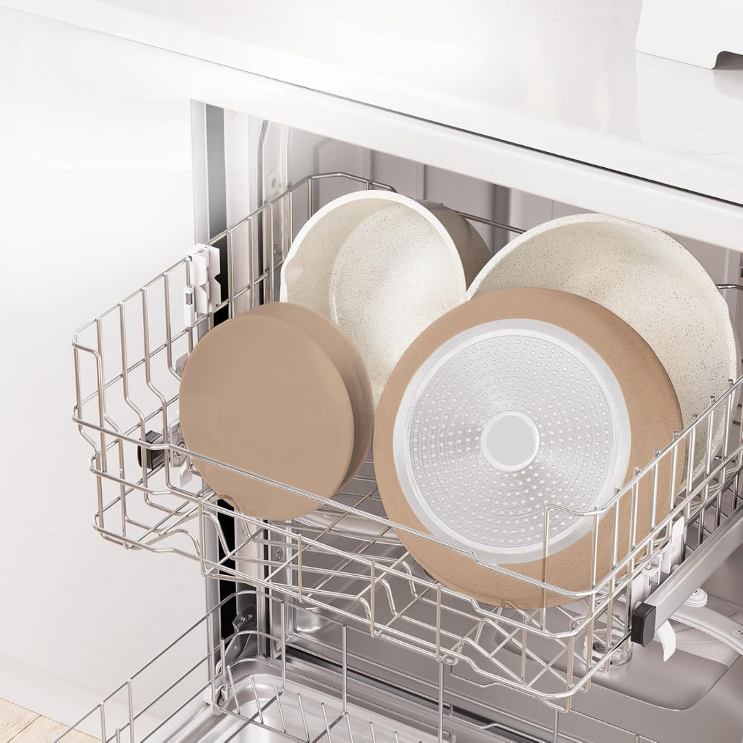 It makes cleaning effortless, saving time and water. Plus, all pieces are dishwasher safe.