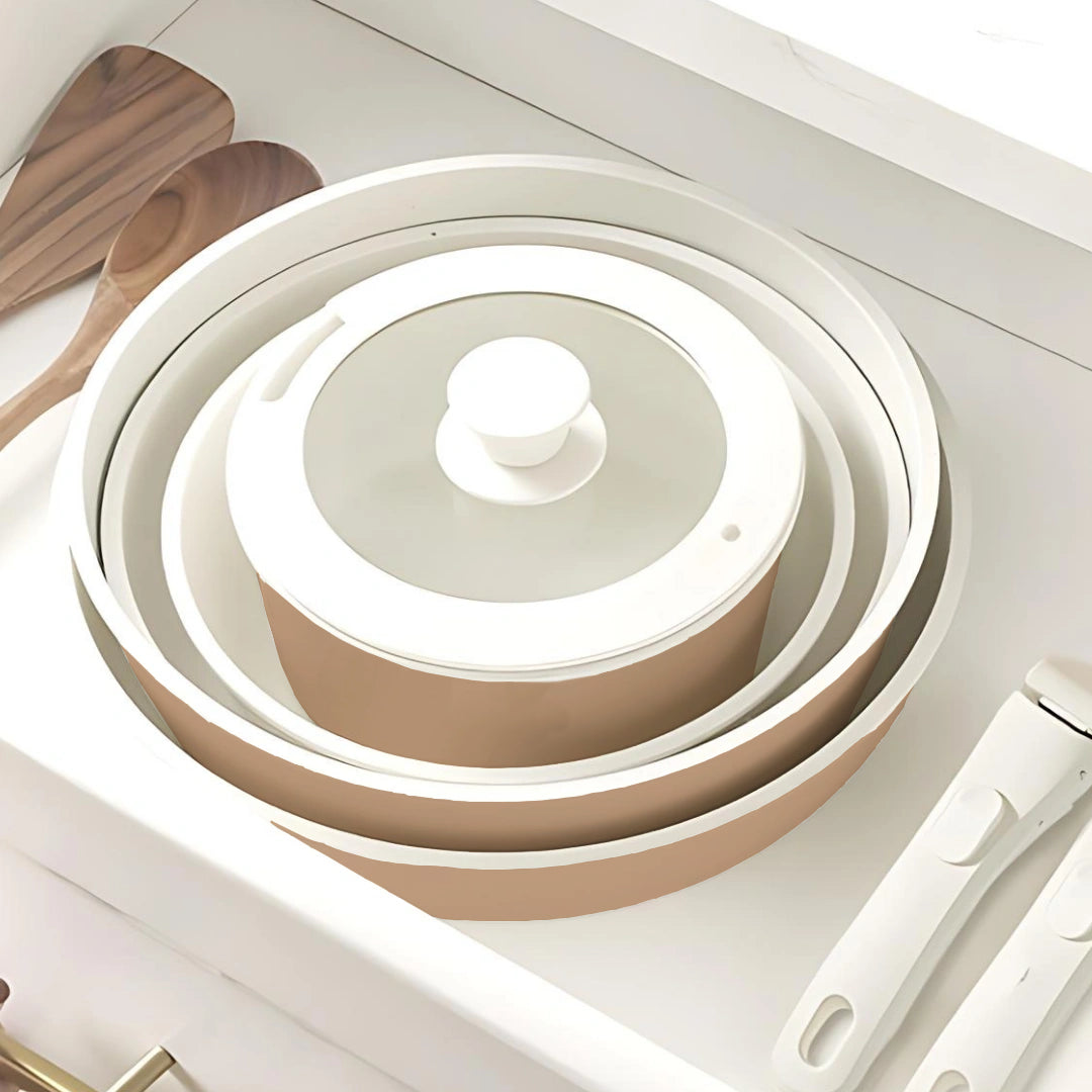 Unlike normal cookware that's impossible to set, these pans fit perfectly into each other allowing you to store it neatly in a compact space without taking up much room.