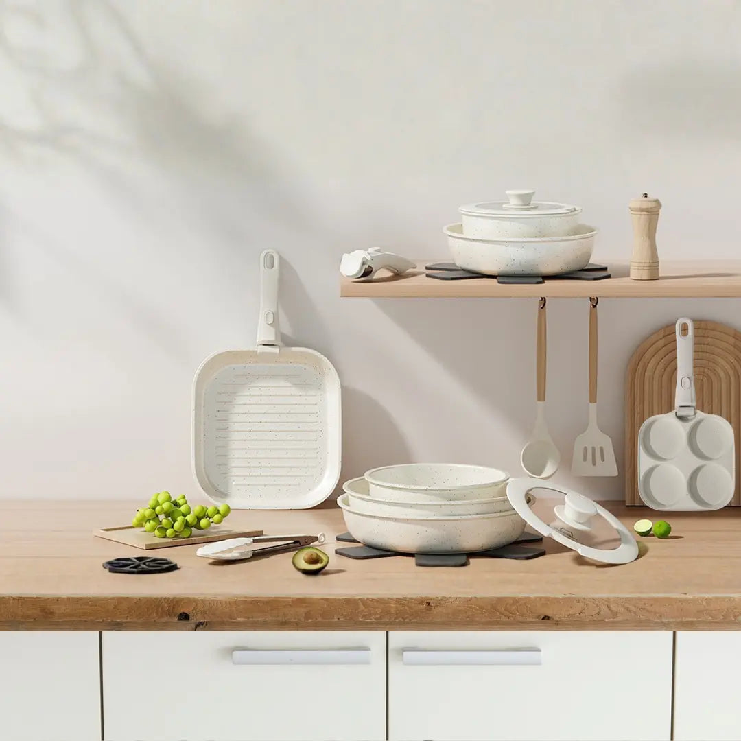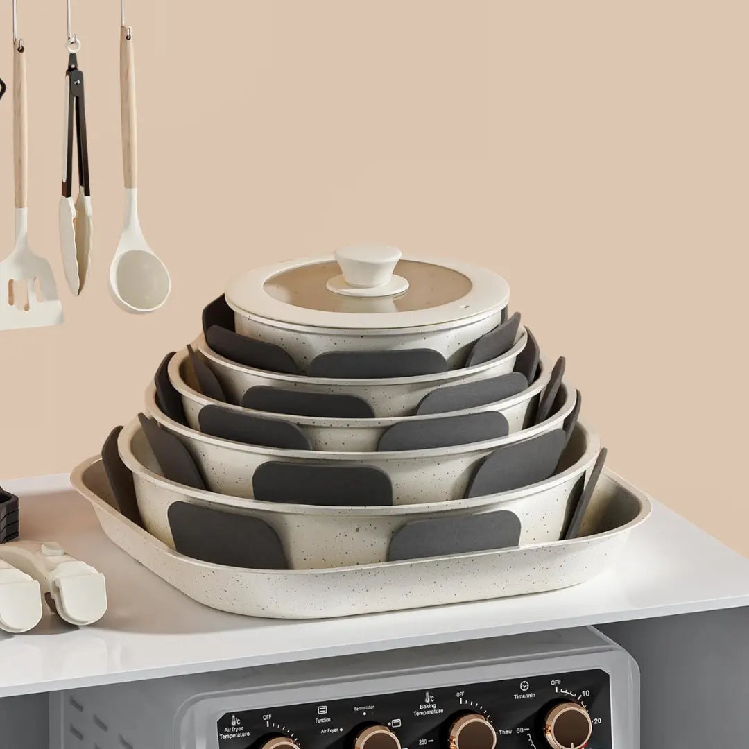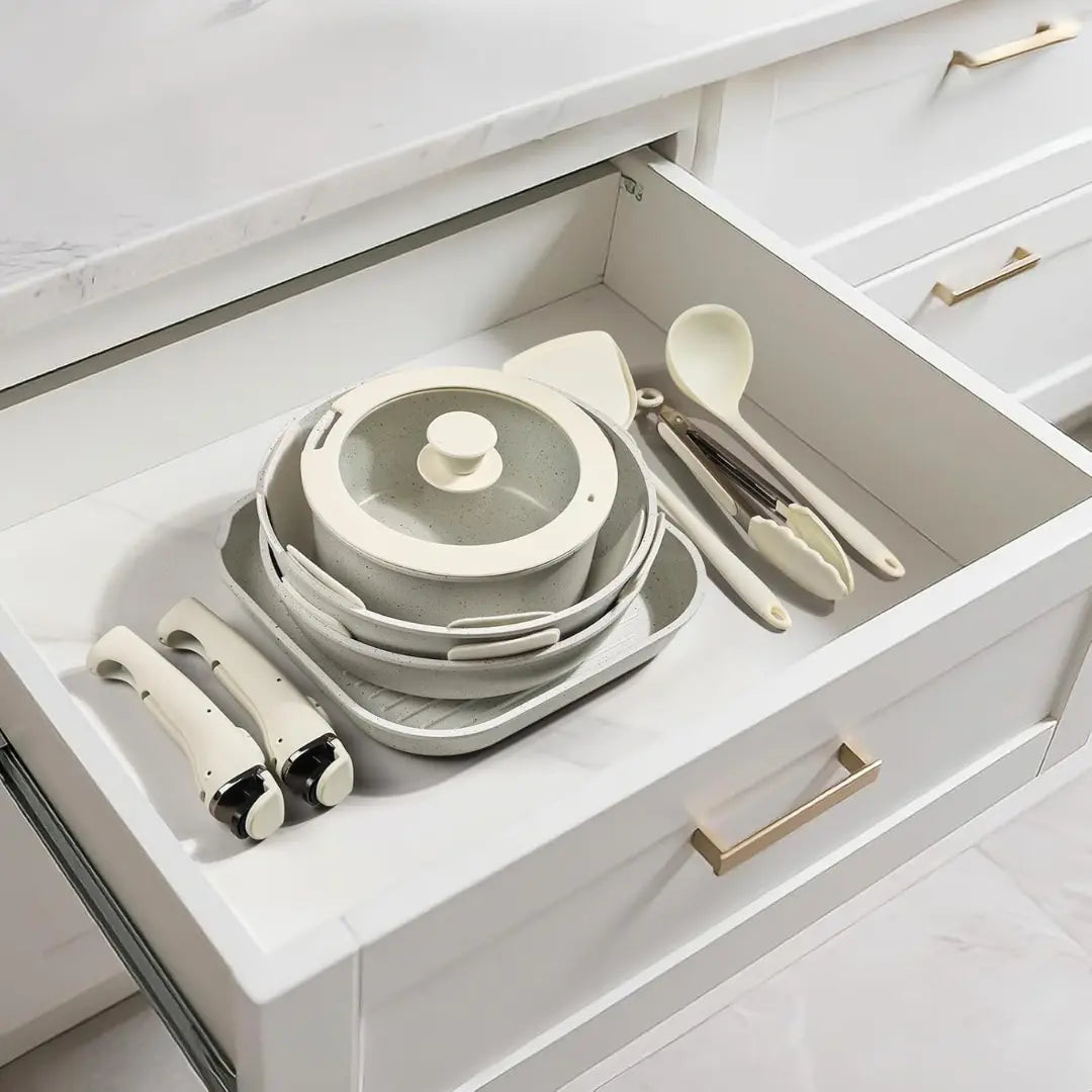 Stackable and non-stick cookware set is completely non-toxic. It gives you effortless cooking with a detachable handle, easy cleaning, and stovetop-to-oven freedom in every meal you make.