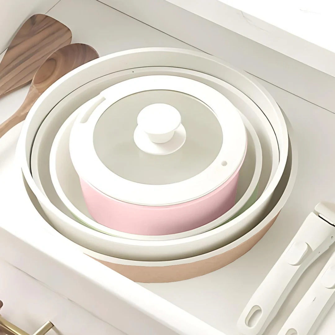 Unlike normal cookware that's impossible to set, these pans fit perfectly into each other allowing you to store it neatly in a compact space without taking up much room.