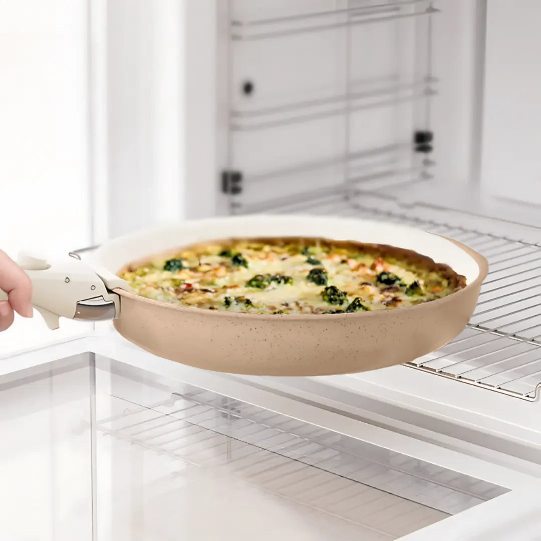 The cookware set uses a detachable handle design to save storage space in your kitchen.