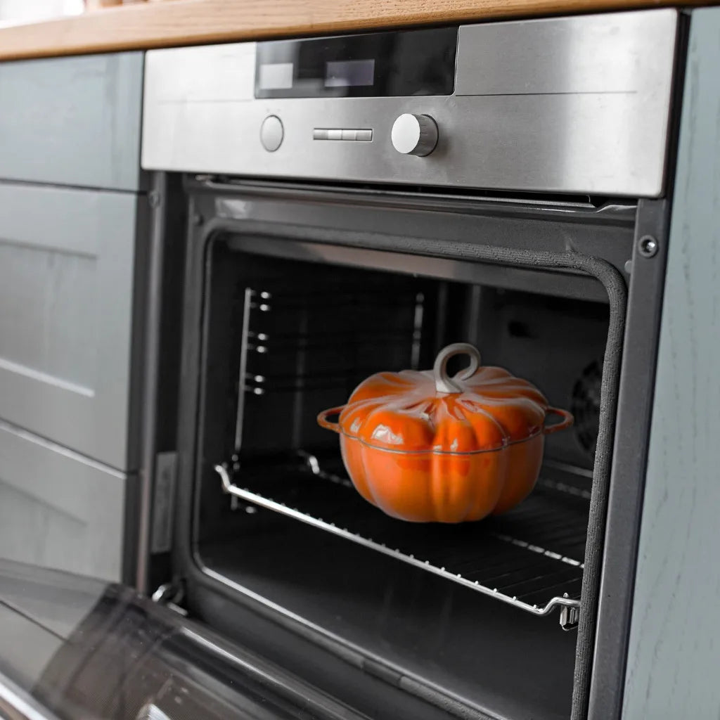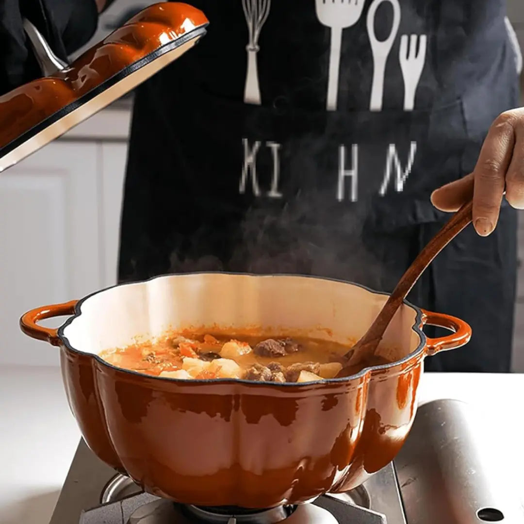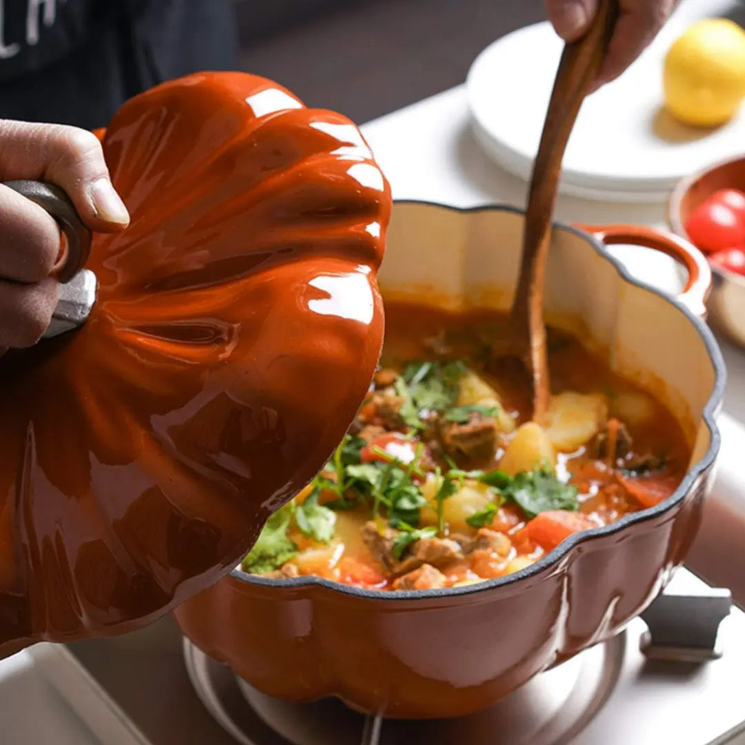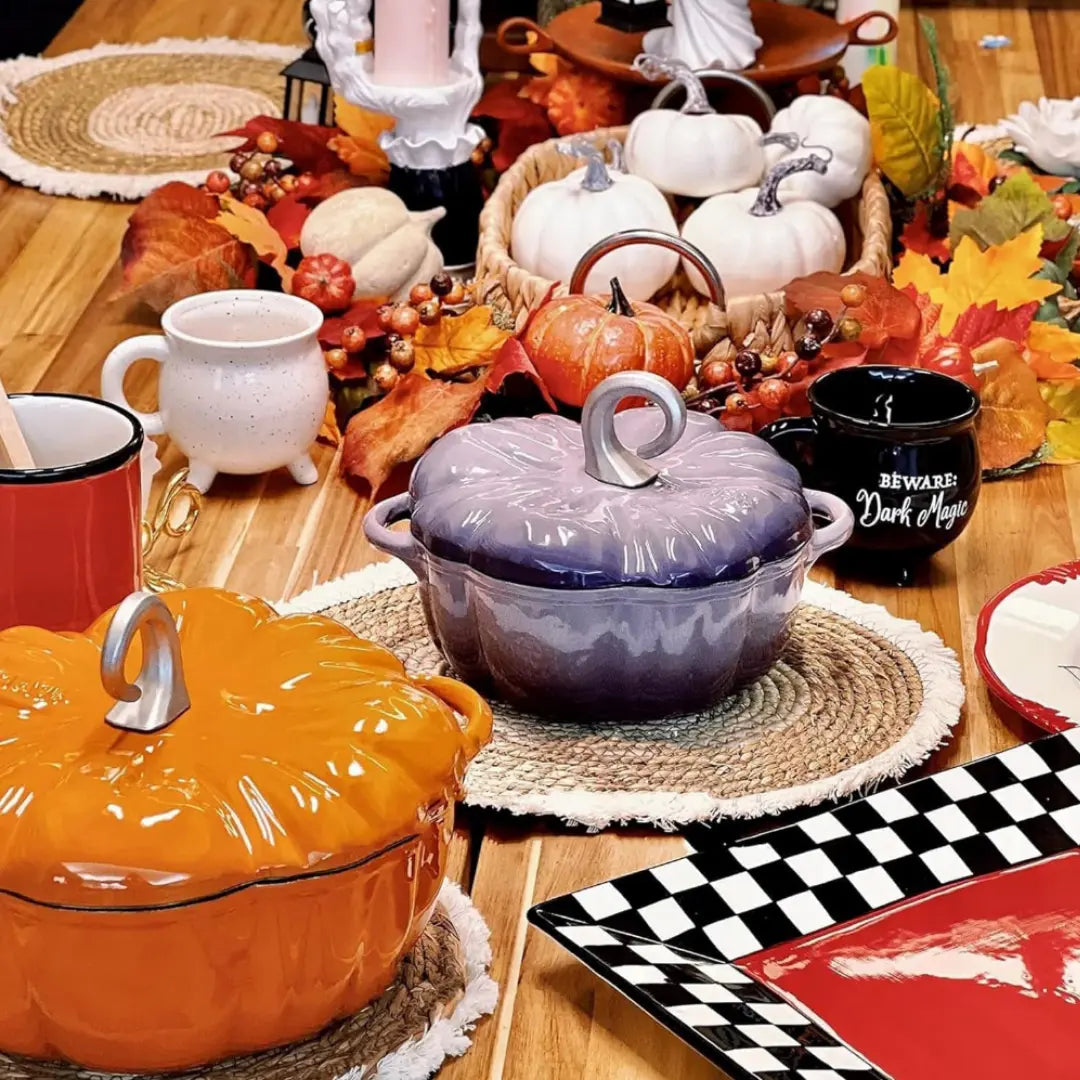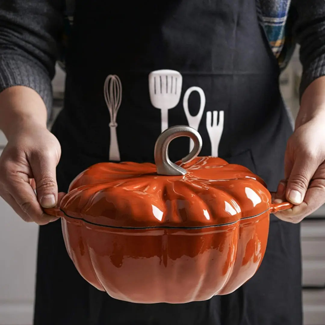 Feel cozy fall vibes with a pumpkin-shaped cast-iron pot in non-toxic, nonstick enamel.